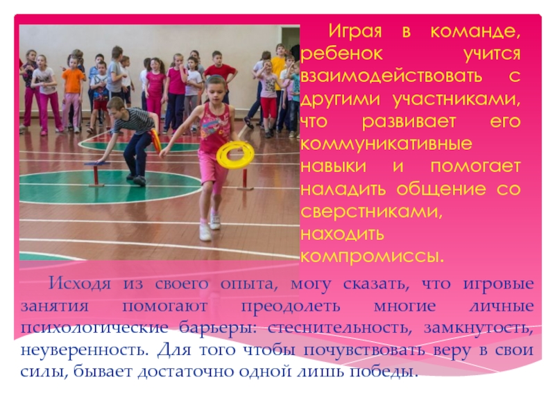 Исходя из своего опыта, могу сказать, что игровые занятия помогают преодолеть многие личные психологические барьеры: стеснительность, замкнутость, неуверенность. Для того чтобы почувствовать веру в свои силы, бывает достаточно одной лишь победы.