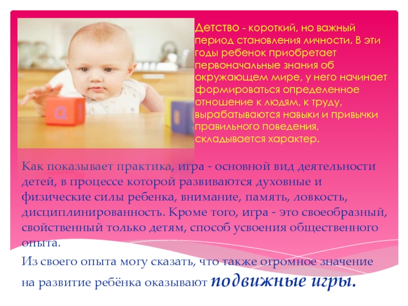 Из своего опыта могу сказать, что также огромное значение на развитие ребёнка оказывают подвижные игры.