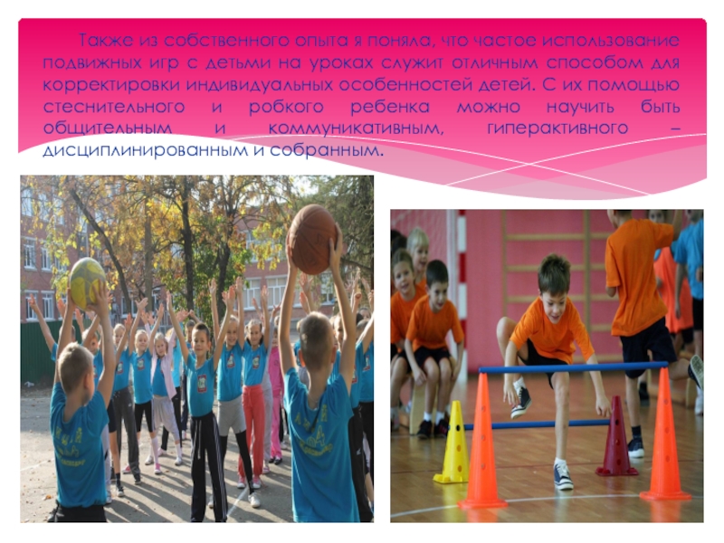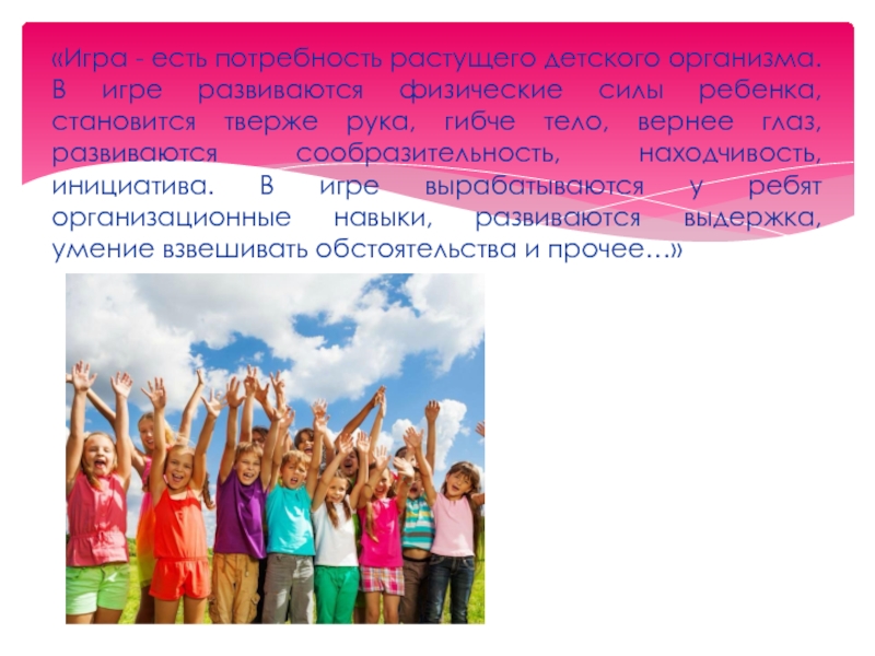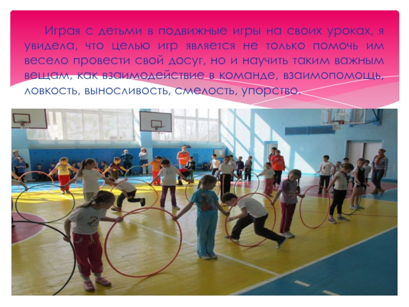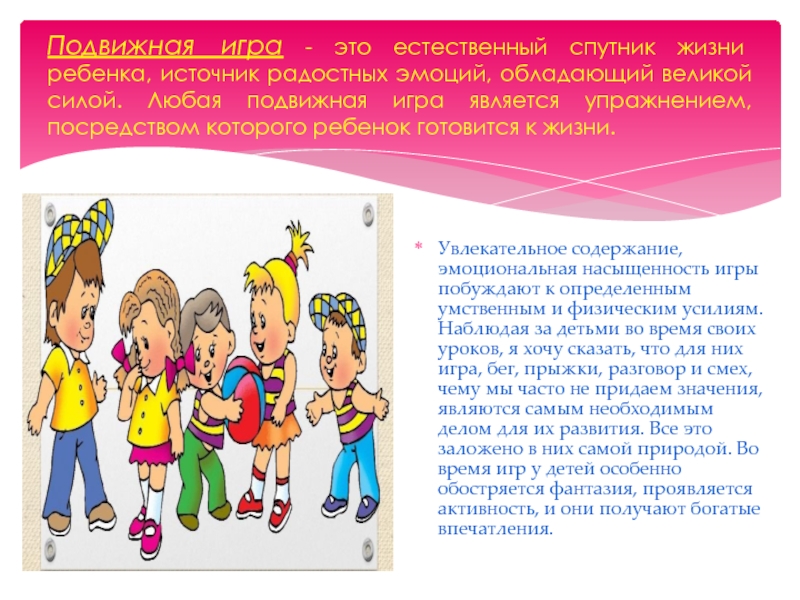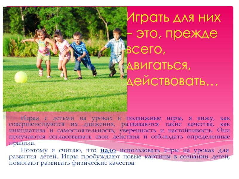 Увлекательное содержание, эмоциональная насыщенность игры побуждают к определенным умственным и физическим усилиям. Наблюдая за детьми во время своих уроков, я хочу сказать, что для них игра, бег, прыжки, разговор и смех, чему мы часто не придаем значения, являются самым необходимым делом для их развития. Все это заложено в них самой природой. Во время игр у детей особенно обостряется фантазия, проявляется активность, и они получают богатые впечатления.