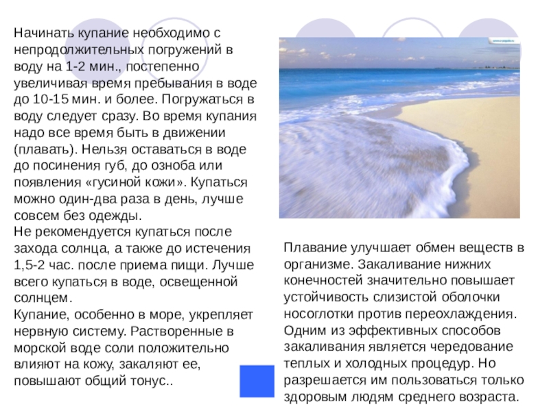 Плавание улучшает обмен веществ в организме. Закаливание нижних конечностей значительно повышает устойчивость слизистой оболочки носоглотки против переохлаждения.