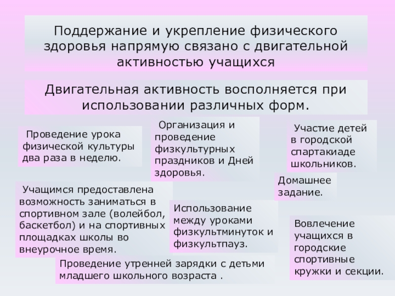 Учащимся предоставлена возможность заниматься в спортивном зале (волейбол, баскетбол) и на спортивных площадках школы во внеурочное время.