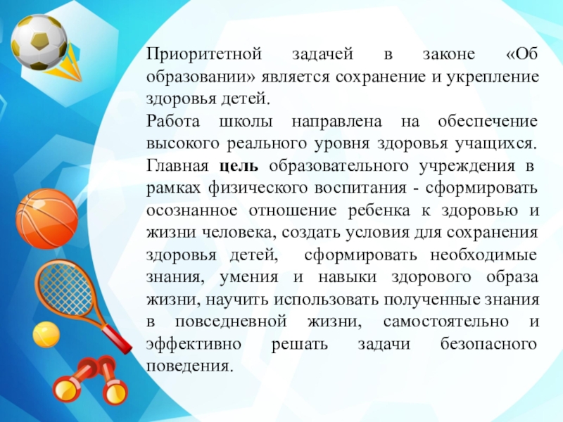 Слайд 2Приоритетной задачей в законе «Об образовании» является сохранение и укрепление здоровья