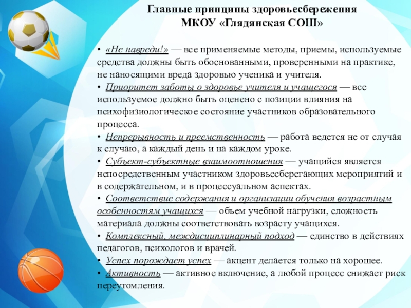 • Субъект-субъектные взаимоотношения — учащийся является непосредственным участником здоровьесберегающих мероприятий и в содержательном, и в процессуальном аспектах.