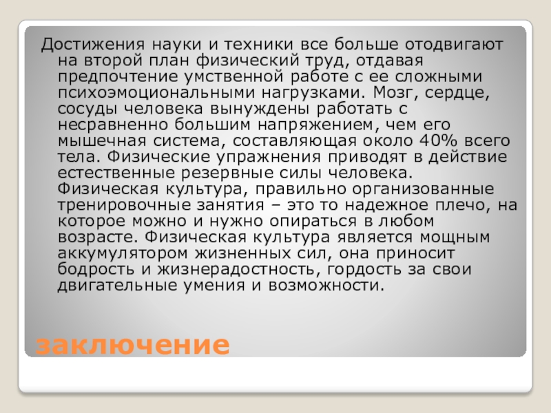 труд, отдавая предпочтение умственной работе с ее сложными психоэмоциональными нагрузками. Мозг, сердце, сосуды человека вынуждены работать с несравненно большим напряжением, чем его мышечная система, составляющая около 40% всего тела. Физические упражнения приводят в действие естественные резервные силы человека. Физическая культура, правильно организованные тренировочные занятия – это то надежное плечо, на которое можно и нужно опираться в любом возрасте. Физическая культура является мощным аккумулятором жизненных сил, она приносит бодрость и жизнерадостность, гордость за свои двигательные умения и возможности.
