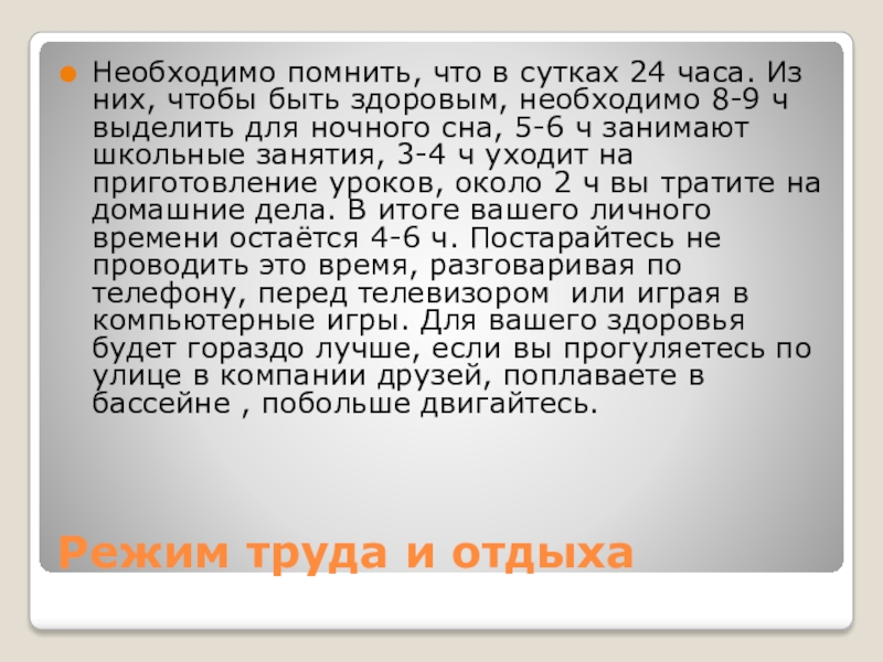 них, чтобы быть здоровым, необходимо 8-9 ч выделить для ночного сна, 5-6 ч занимают школьные занятия, 3-4 ч уходит на приготовление уроков, около 2 ч вы тратите на домашние дела. В итоге вашего личного времени остаётся 4-6 ч. Постарайтесь не проводить это время, разговаривая по телефону, перед телевизором или играя в компьютерные игры. Для вашего здоровья будет гораздо лучше, если вы прогуляетесь по улице в компании друзей, поплаваете в бассейне , побольше двигайтесь.