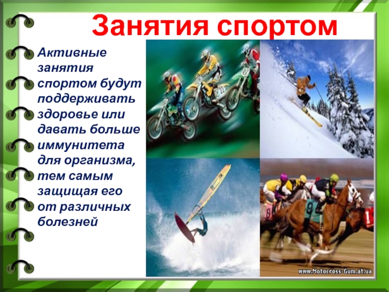 Занятия спортомАктивные занятия спортом будут поддерживать здоровье или давать больше иммунитета для организма, тем самым защищая его