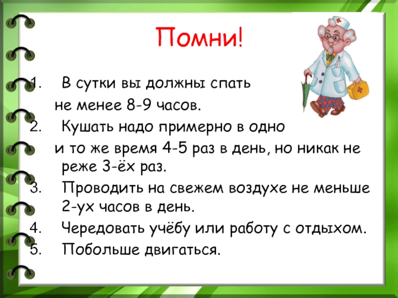 Помни!В сутки вы должны спать 	не менее 8-9 часов.Кушать надо примерно в одно 	и то же время