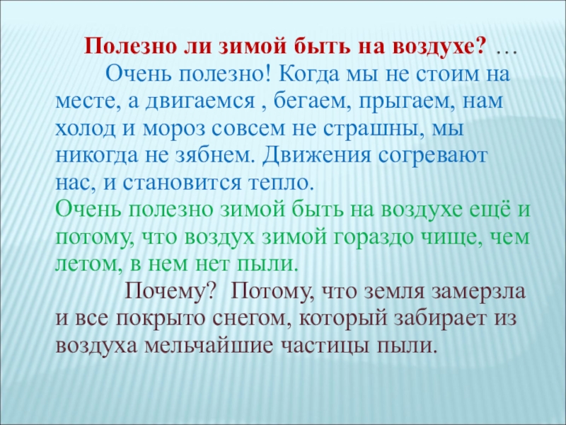 Очень полезно! Когда мы не стоим на месте, а двигаемся , бегаем, прыгаем, нам холод и мороз совсем не страшны, мы никогда не зябнем. Движения согревают нас, и становится тепло. Очень полезно зимой быть на воздухе ещё и потому, что воздух зимой гораздо чище, чем летом, в нем нет пыли.