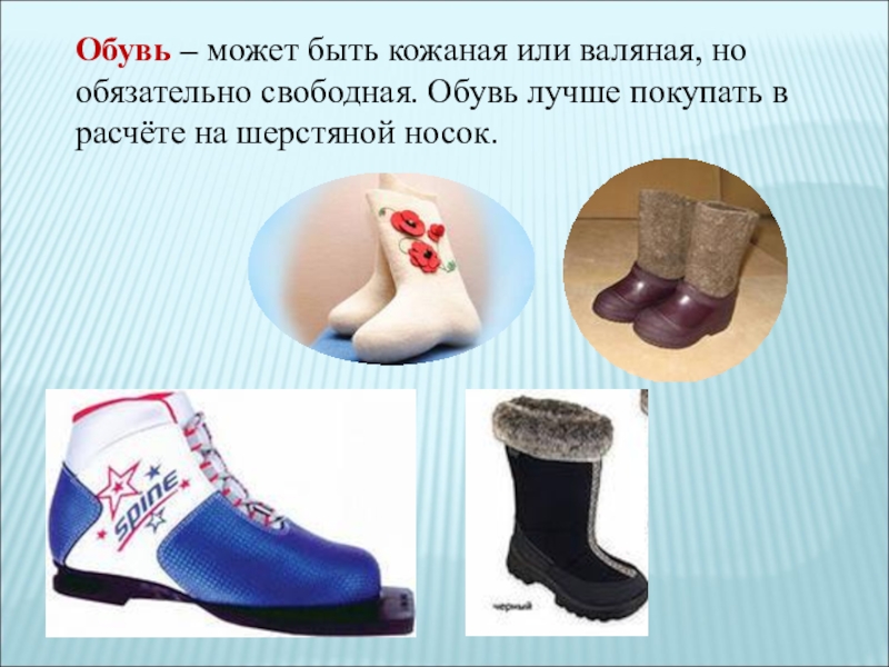 Слайд 23Обувь – может быть кожаная или валяная, но обязательно свободная. Обувь лучше