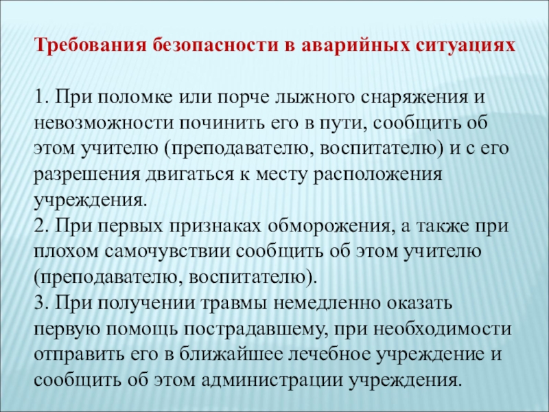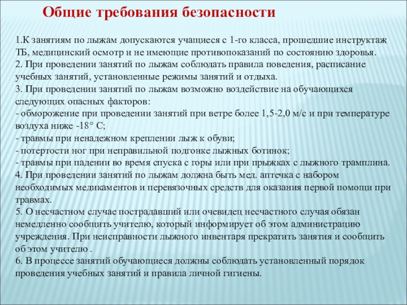 5. О несчастном случае пострадавший или очевидец несчастного случая обязан немедленно сообщить учителю, который информирует об этом администрацию учреждения. При неисправности лыжного инвентаря прекратить занятия и сообщить об этом учителю .