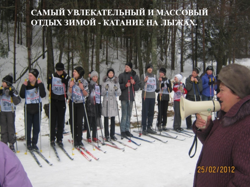 Слайд 8САМЫЙ УВЛЕКАТЕЛЬНЫЙ И МАССОВЫЙ ОТДЫХ ЗИМОЙ - КАТАНИЕ НА ЛЫЖАХ.