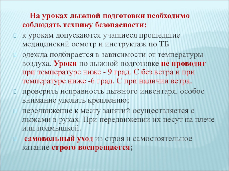 одежда подбирается в зависимости от температуры воздуха. Уроки по лыжной подготовке не проводят при температуре ниже - 9 град. С без ветра и при температуре ниже -6 град. С при наличии ветра.