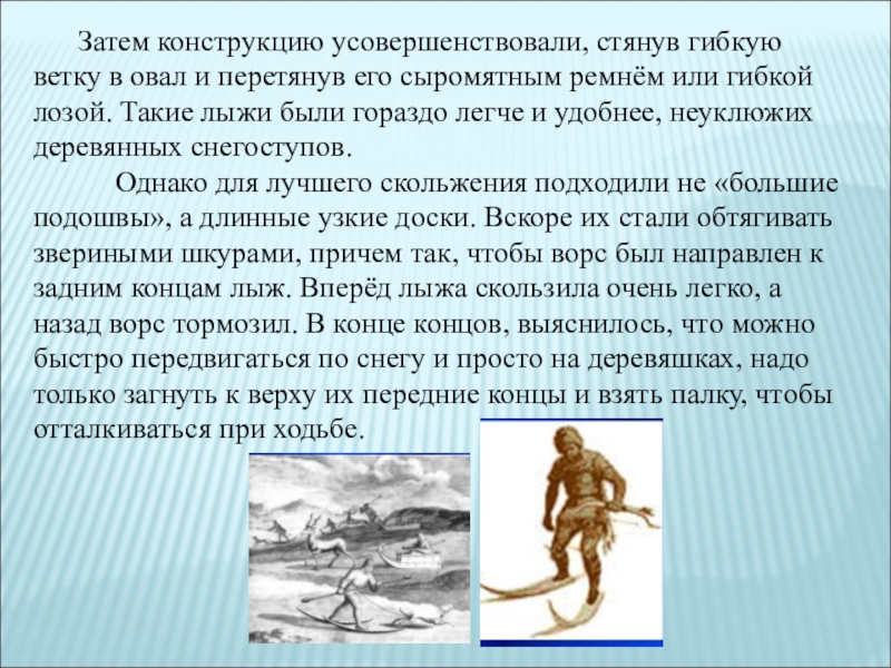 Однако для лучшего скольжения подходили не «большие подошвы», а длинные узкие доски. Вскоре их стали обтягивать звериными шкурами, причем так, чтобы ворс был направлен к задним концам лыж. Вперёд лыжа скользила очень легко, а назад ворс тормозил. В конце концов, выяснилось, что можно быстро передвигаться по снегу и просто на деревяшках, надо только загнуть к верху их передние концы и взять палку, чтобы отталкиваться при ходьбе.