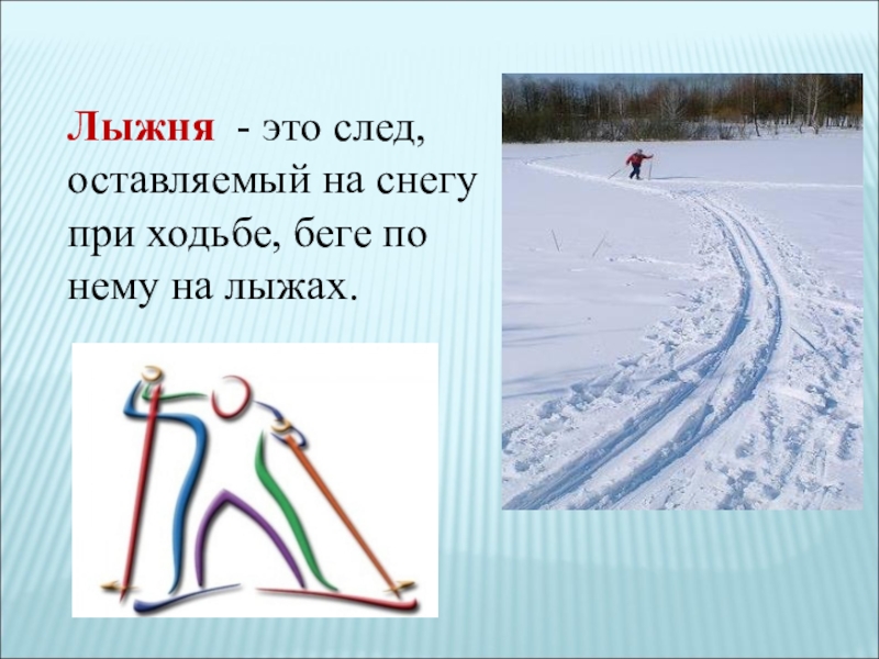 Слайд 11Лыжня - это след, оставляемый на снегу при ходьбе, беге по