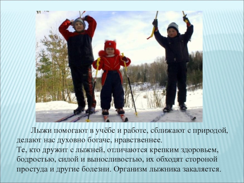 с природой, делают нас духовно богаче, нравственнее. Те, кто дружит с лыжней, отличаются крепким здоровьем, бодростью, силой и выносливостью, их обходят стороной простуда и другие болезни. Организм лыжника закаляется.