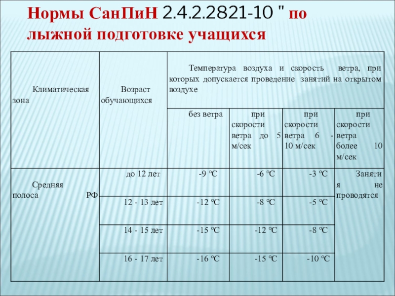Слайд 25Нормы СанПиН 2.4.2.2821-10 " по лыжной подготовке учащихся