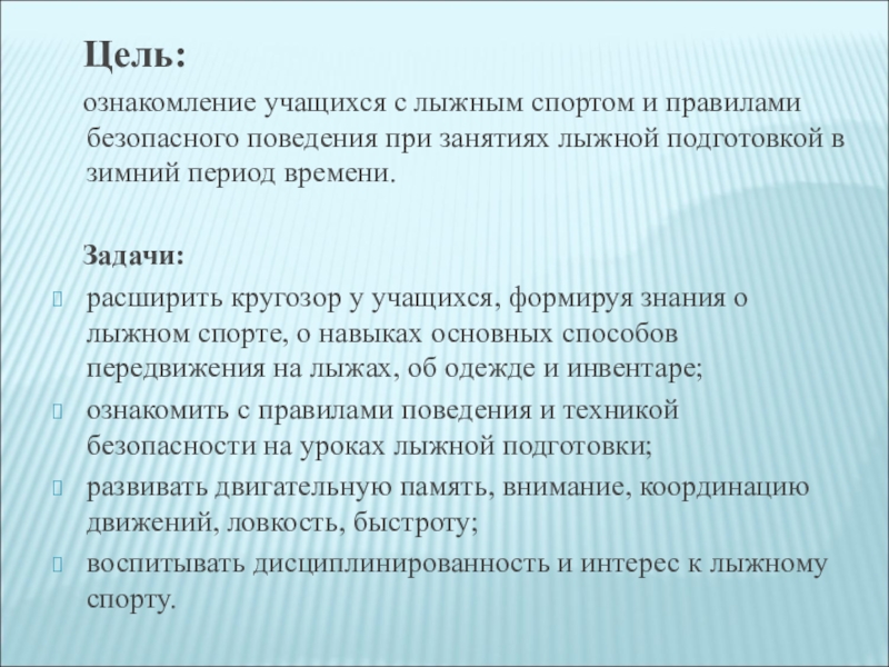 расширить кругозор у учащихся, формируя знания о лыжном спорте, о навыках основных способов передвижения на лыжах, об одежде и инвентаре;
