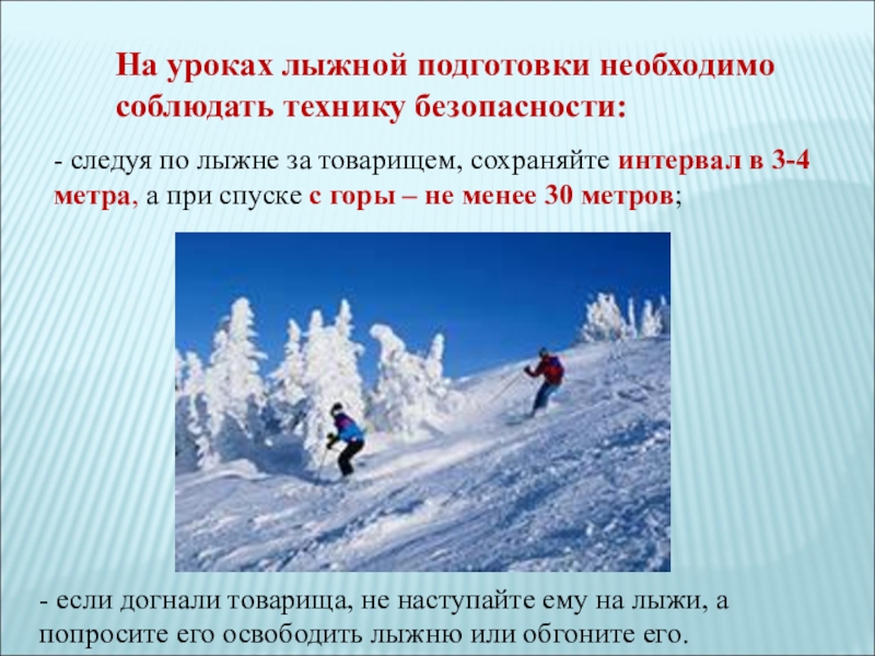 - следуя по лыжне за товарищем, сохраняйте интервал в 3-4 метра,