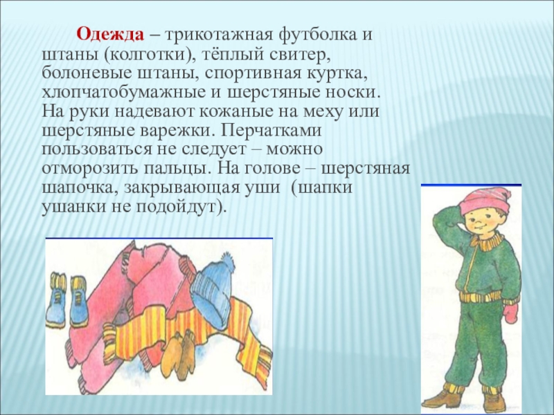 Слайд 22 Одежда – трикотажная футболка и штаны (колготки), тёплый свитер, болоневые штаны, спортивная