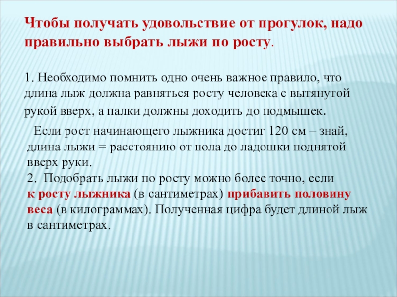 Слайд 15Чтобы получать удовольствие от прогулок, надо правильно выбрать лыжи по росту.
