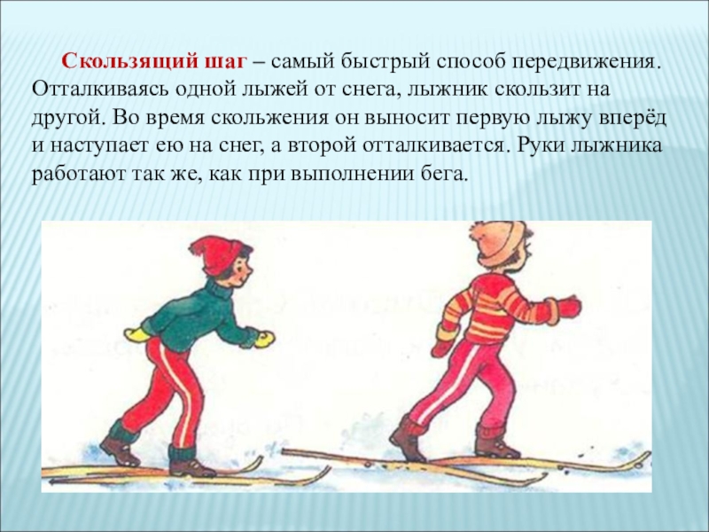 лыжей от снега, лыжник скользит на другой. Во время скольжения он выносит первую лыжу вперёд и наступает ею на снег, а второй отталкивается. Руки лыжника работают так же, как при выполнении бега.