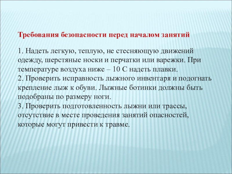3. Проверить подготовленность лыжни или трассы, отсутствие в месте проведения занятий опасностей, которые могут привести к травме.