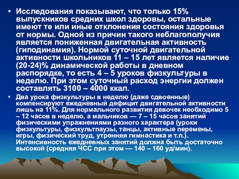 те или иные отклонения состояния здоровья от нормы. Одной из причин такого неблагополучия является пониженная двигательная активность (гиподинамия). Нормой суточной двигательной активности школьников 11 – 15 лет является наличие (20-24)% динамической работы в дневном распорядке, то есть 4 – 5 уроков физкультуры в неделю. При этом суточный расход энергии должен составлять 3100 – 4000 ккал.