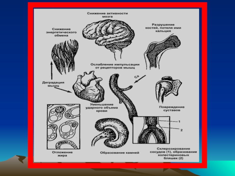 Существенно изменяются и обменные процессы: уменьшается толерантность к глюкозе, повышается содержание общего холестерина и триглицеридов в крови, это характерно для развития атеросклероза (хроническое сердечно-сосудистое заболевание), ухудшается состояние опорно-двигательного аппарата: происходит разрежение костной ткани (остеопороз) вследствие потери солей кальция. Недостаточная двигательная активность и недостаток кальция в пище усугубляют эти изменения.