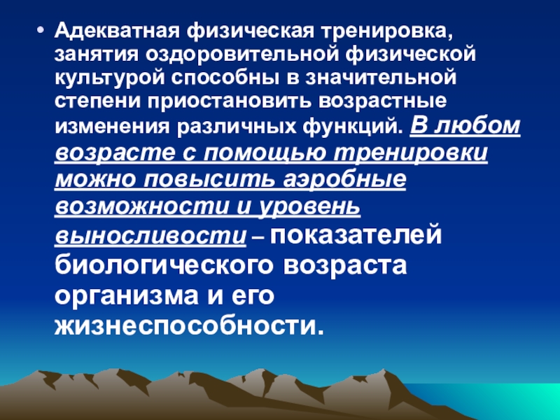 приостановить возрастные изменения различных функций. В любом возрасте с помощью тренировки можно повысить аэробные возможности и уровень выносливости – показателей биологического возраста организма и его жизнеспособности.