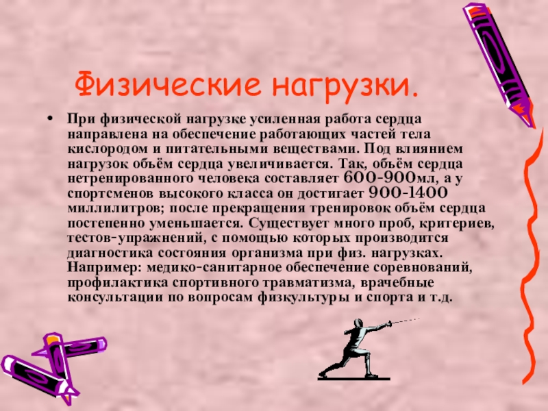 частей тела кислородом и питательными веществами. Под влиянием нагрузок объём сердца увеличивается. Так, объём сердца нетренированного человека составляет 600-900мл, а у спортсменов высокого класса он достигает 900-1400 миллилитров; после прекращения тренировок объём сердца постепенно уменьшается. Существует много проб, критериев, тестов-упражнений, с помощью которых производится диагностика состояния организма при физ. нагрузках. Например: медико-санитарное обеспечение соревнований, профилактика спортивного травматизма, врачебные консультации по вопросам физкультуры и спорта и т.д.