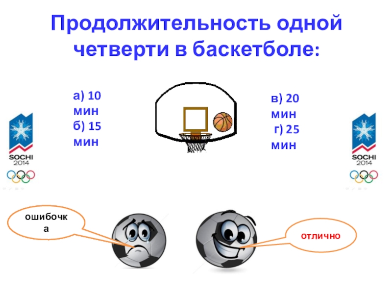 Слайд 8Продолжительность одной четверти в баскетболе: