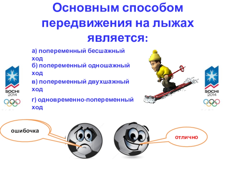 Основным способом передвижения на лыжах является: а) попеременный бесшажный ходб) попеременный одношажный ходв) попеременный двухшажный ходг) одновременно-попеременный