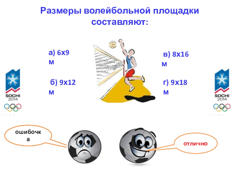 Размеры волейбольной площадки составляют: а) 6х9 м б) 9х12 м в) 8х16 мг) 9х18 м