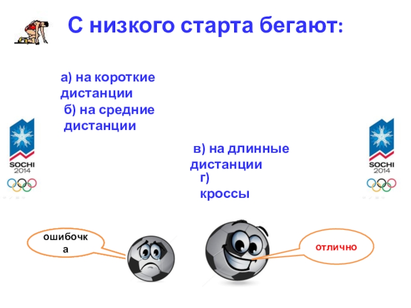 С низкого старта бегают: а) на короткие дистанцииб) на средние дистанции в) на длинные дистанцииг) кроссы