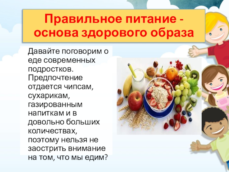Правильное питание - основа здорового образа  Давайте поговорим о еде современных подростков. Предпочтение отдается чипсам, сухарикам,