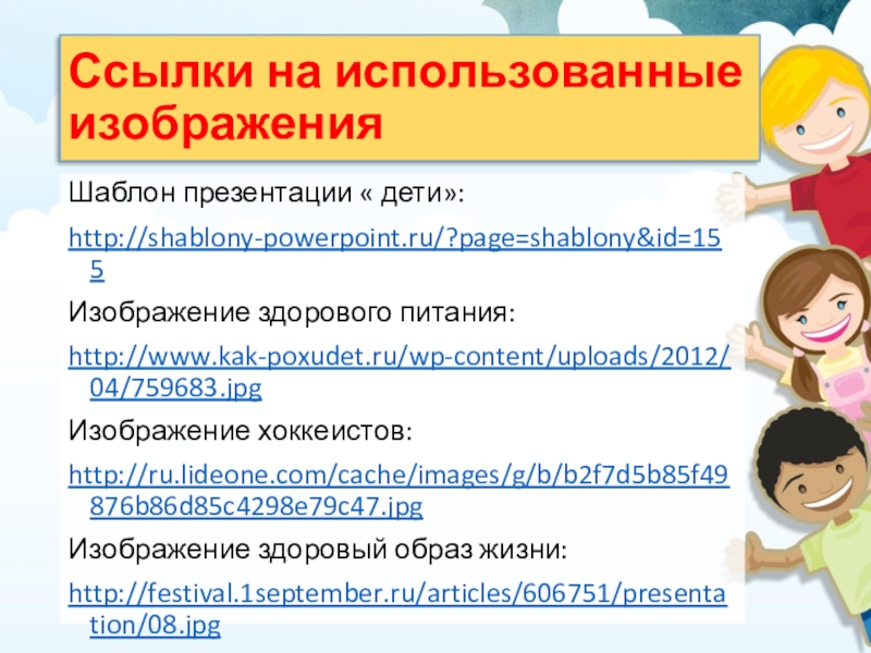 Ссылки на использованные изображенияШаблон презентации « дети»: http://shablony-powerpoint.ru/?page=shablony&id=155 Изображение здорового питания:http://www.kak-poxudet.ru/wp-content/uploads/2012/04/759683.jpg Изображение хоккеистов:http://ru.lideone.com/cache/images/g/b/b2f7d5b85f49876b86d85c4298e79c47.jpg Изображение здоровый образ жизни:http://festival.1september.ru/articles/606751/presentation/08.jpg