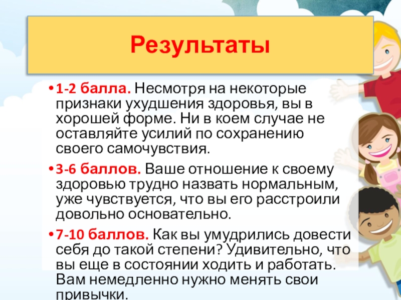 Результаты1-2 балла. Несмотря на некоторые признаки ухудшения здоровья, вы в хорошей форме. Ни в коем случае не