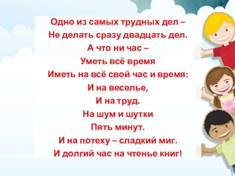 Одно из самых трудных дел – Не делать сразу двадцать дел.А что ни час – Уметь всё