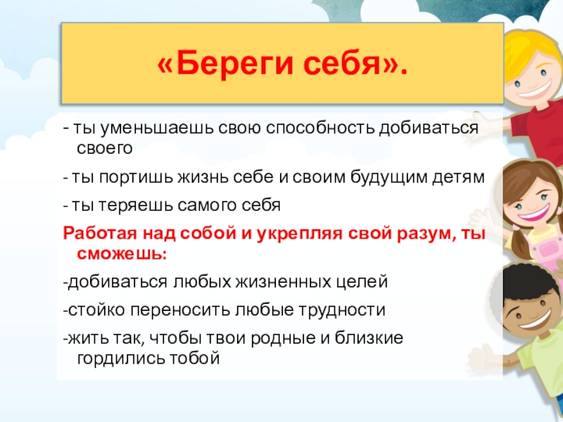 «Береги себя».- ты уменьшаешь свою способность добиваться своего- ты портишь жизнь себе и своим будущим детям- ты