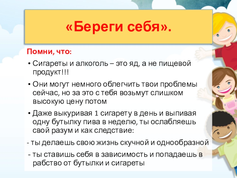 «Береги себя».Помни, что:Сигареты и алкоголь – это яд, а не пищевой продукт!!!Они могут немного облегчить твои проблемы