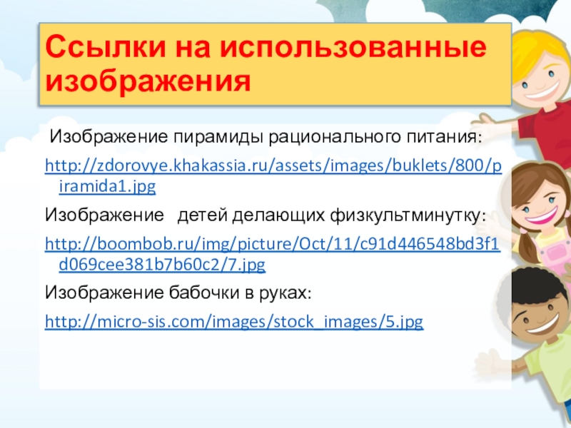 Ссылки на использованные изображения Изображение пирамиды рационального питания:http://zdorovye.khakassia.ru/assets/images/buklets/800/piramida1.jpg Изображение  детей делающих физкультминутку:http://boombob.ru/img/picture/Oct/11/c91d446548bd3f1d069cee381b7b60c2/7.jpg Изображение бабочки в руках:http://micro-sis.com/images/stock_images/5.jpg