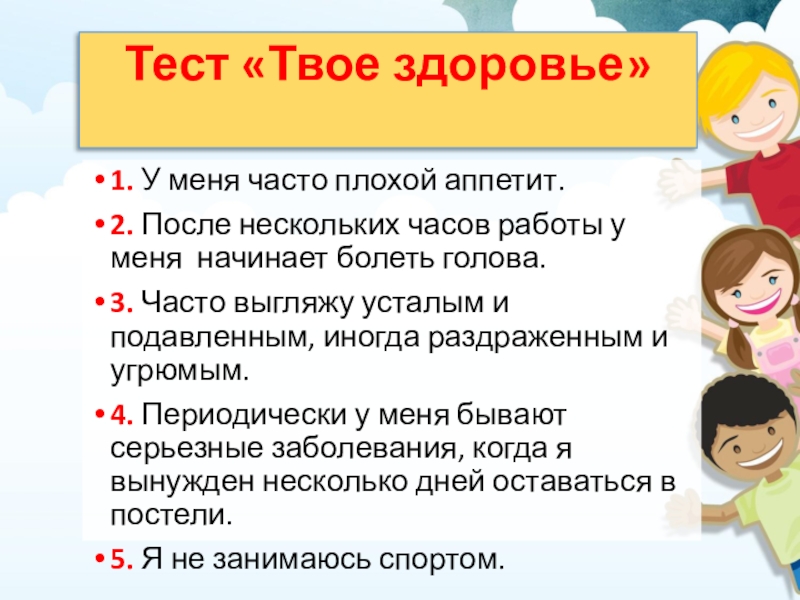 Тест «Твое здоровье» 1. У меня часто плохой аппетит.2. После нескольких часов работы у меня начинает болеть