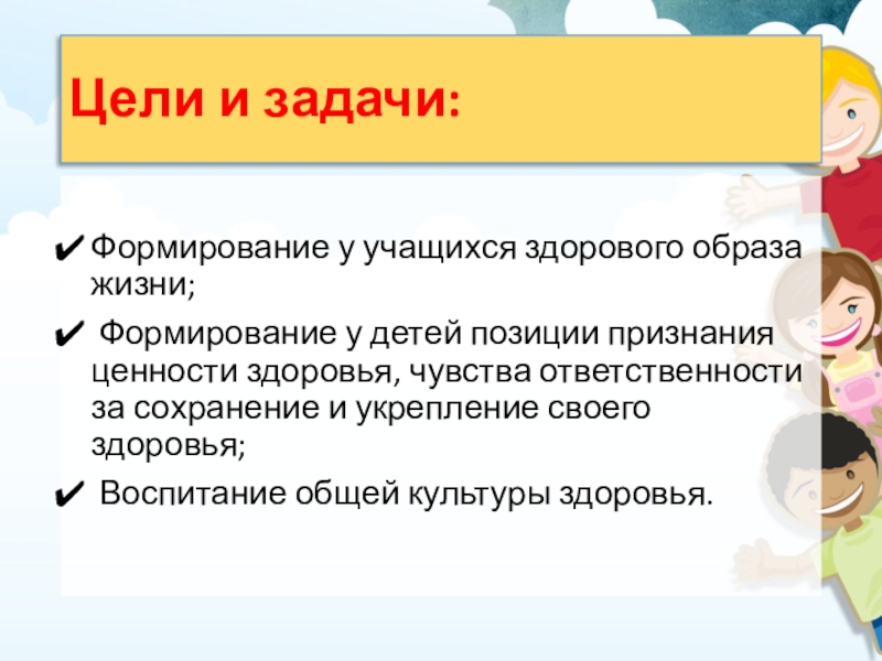 Цели и задачи:Формирование у учащихся здорового образа жизни; Формирование у детей позиции признания ценности здоровья, чувства ответственности за сохранение и укрепление своего здоровья; Воспитание общей культуры здоровья.