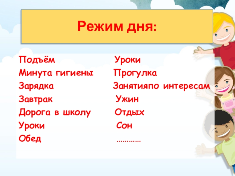 Режим дня:Подъём        Уроки   Минута гигиены   ПрогулкаЗарядка