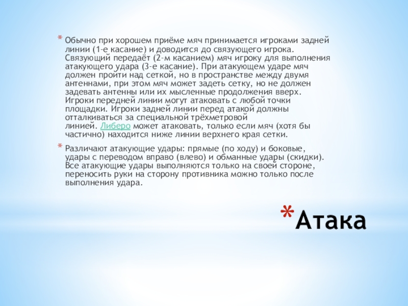 и доводится до связующего игрока. Связующий передаёт (2-м касанием) мяч игроку для выполнения атакующего удара (3-е касание). При атакующем ударе мяч должен пройти над сеткой, но в пространстве между двумя антеннами, при этом мяч может задеть сетку, но не должен задевать антенны или их мысленные продолжения вверх. Игроки передней линии могут атаковать с любой точки площадки. Игроки задней линии перед атакой должны отталкиваться за специальной трёхметровой линией. Либеро может атаковать, только если мяч (хотя бы частично) находится ниже линии верхнего края сетки.