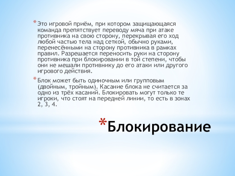 атаке противника на свою сторону, перекрывая его ход любой частью тела над сеткой, обычно руками, перенесёнными на сторону противника в рамках правил. Разрешается переносить руки на сторону противника при блокировании в той степени, чтобы они не мешали противнику до его атаки или другого игрового действия.
