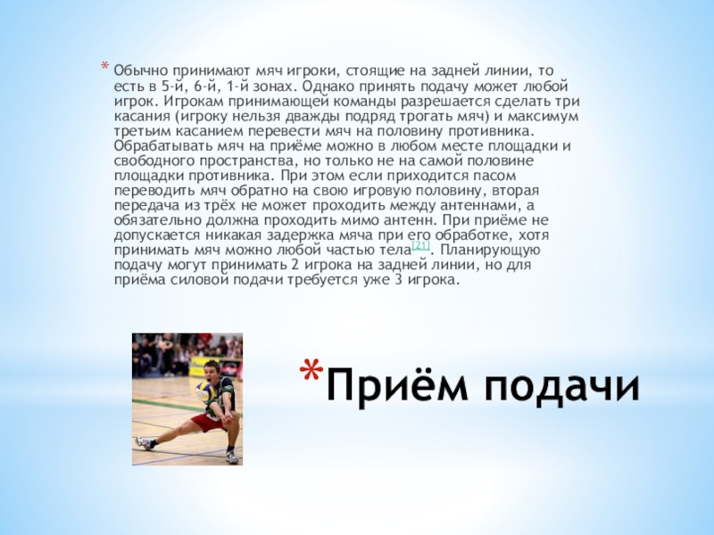 в 5-й, 6-й, 1-й зонах. Однако принять подачу может любой игрок. Игрокам принимающей команды разрешается сделать три касания (игроку нельзя дважды подряд трогать мяч) и максимум третьим касанием перевести мяч на половину противника. Обрабатывать мяч на приёме можно в любом месте площадки и свободного пространства, но только не на самой половине площадки противника. При этом если приходится пасом переводить мяч обратно на свою игровую половину, вторая передача из трёх не может проходить между антеннами, а обязательно должна проходить мимо антенн. При приёме не допускается никакая задержка мяча при его обработке, хотя принимать мяч можно любой частью тела[21]. Планирующую подачу могут принимать 2 игрока на задней линии, но для приёма силовой подачи требуется уже 3 игрока.