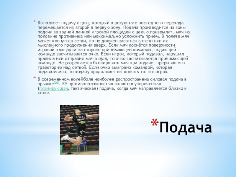в первую зону. Подача производится из зоны подачи за задней линией игровой площадки с целью приземлить мяч на половине противника или максимально усложнить приём. В полёте мяч может коснуться сетки, но не должен касаться антенн или их мысленного продолжения вверх. Если мяч коснётся поверхности игровой площадки на стороне принимающей команды, подающей команде засчитывается очко. Если игрок, который подавал, нарушил правила или отправил мяч в аут, то очко засчитывается принимающей команде. Не разрешается блокировать мяч при подаче, прерывая его траекторию над сеткой. Если очко выиграно командой, которая подавала мяч, то подачу продолжает выполнять тот же игрок.