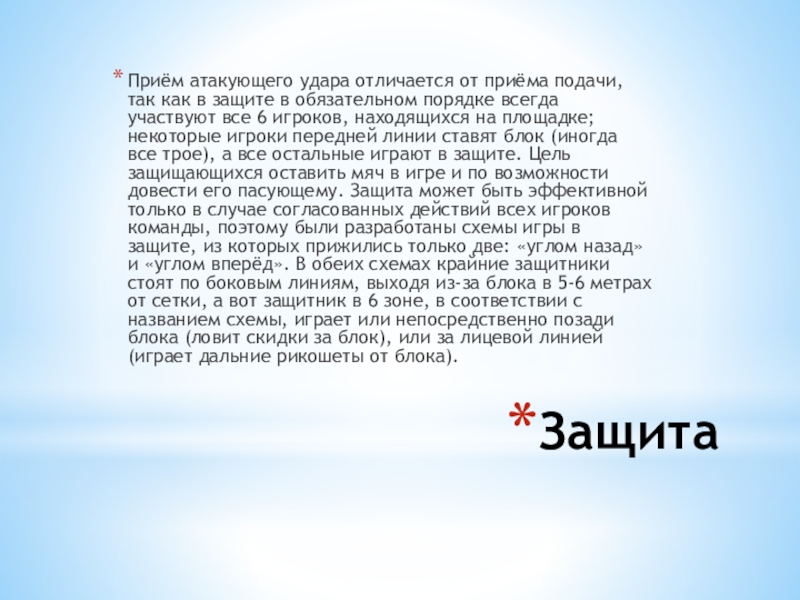 в обязательном порядке всегда участвуют все 6 игроков, находящихся на площадке; некоторые игроки передней линии ставят блок (иногда все трое), а все остальные играют в защите. Цель защищающихся оставить мяч в игре и по возможности довести его пасующему. Защита может быть эффективной только в случае согласованных действий всех игроков команды, поэтому были разработаны схемы игры в защите, из которых прижились только две: «углом назад» и «углом вперёд». В обеих схемах крайние защитники стоят по боковым линиям, выходя из-за блока в 5-6 метрах от сетки, а вот защитник в 6 зоне, в соответствии с названием схемы, играет или непосредственно позади блока (ловит скидки за блок), или за лицевой линией (играет дальние рикошеты от блока).