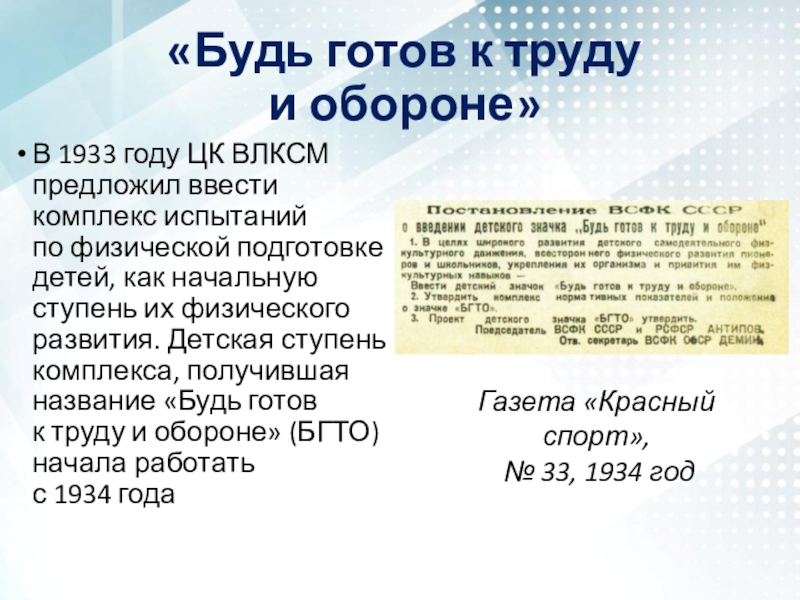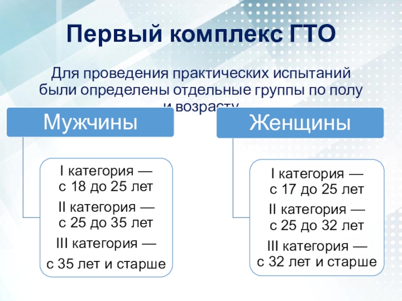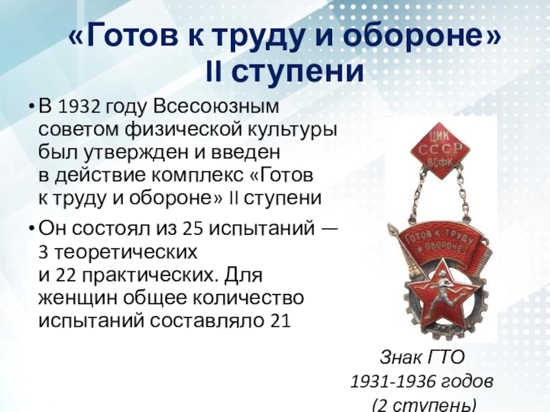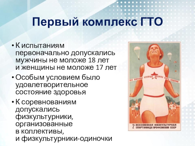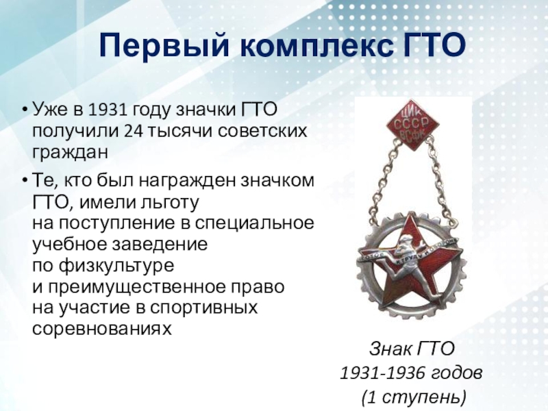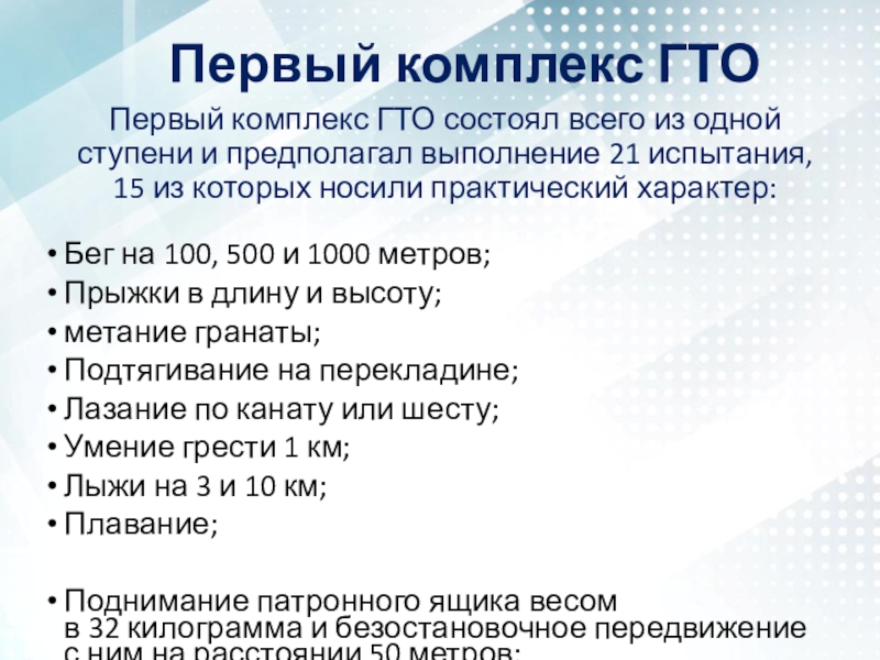 Первый комплекс ГТО состоял всего из одной ступени и предполагал выполнение 21 испытания, 15 из которых носили практический характер: